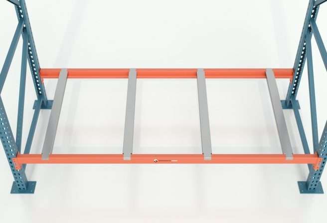 Pallet supports are steel channels that drop between pallet rack beams to provide additional reinforcement and stability for stored pallets. They help prevent pallets from sagging or falling through when not fully supported by the beams, improving overall safety and load distribution. Pallet supports are commonly used with wire decking or as a standalone option in selective rack systems.